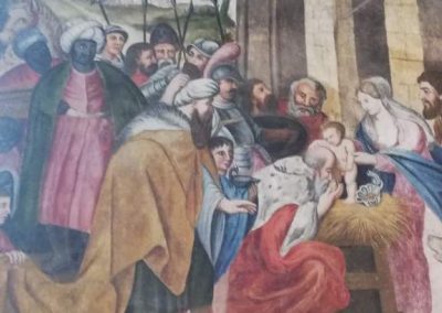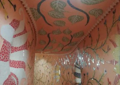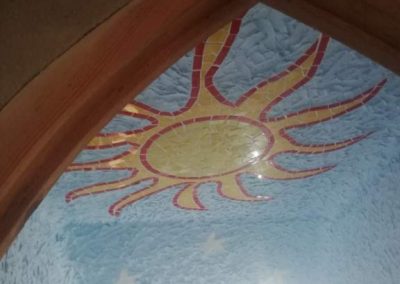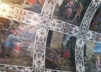 Al pasar la puerta de la ermita la sorpresa es inmensa, su amplia nave de techo cóncavo alberga cuadros con las historias del antiguo testamento, como en la Capilla Sixtina romana. Los 26 cuadros, que no se presentan en orden cronológico, muestran la creación de Adán, de Eva, la expulsión de ambos del paraíso, los animales subiendo al Arca de Noé, que incluye no solo mamíferos sino también aves, o el momento en que el ángel detiene a Abraham cuando éste iba a matar a su hijo. Las imágenes están insertadas en una enorme cuadrícula que recoge flores y figuras humanas en las que descubrimos ligeras alas amarillas.